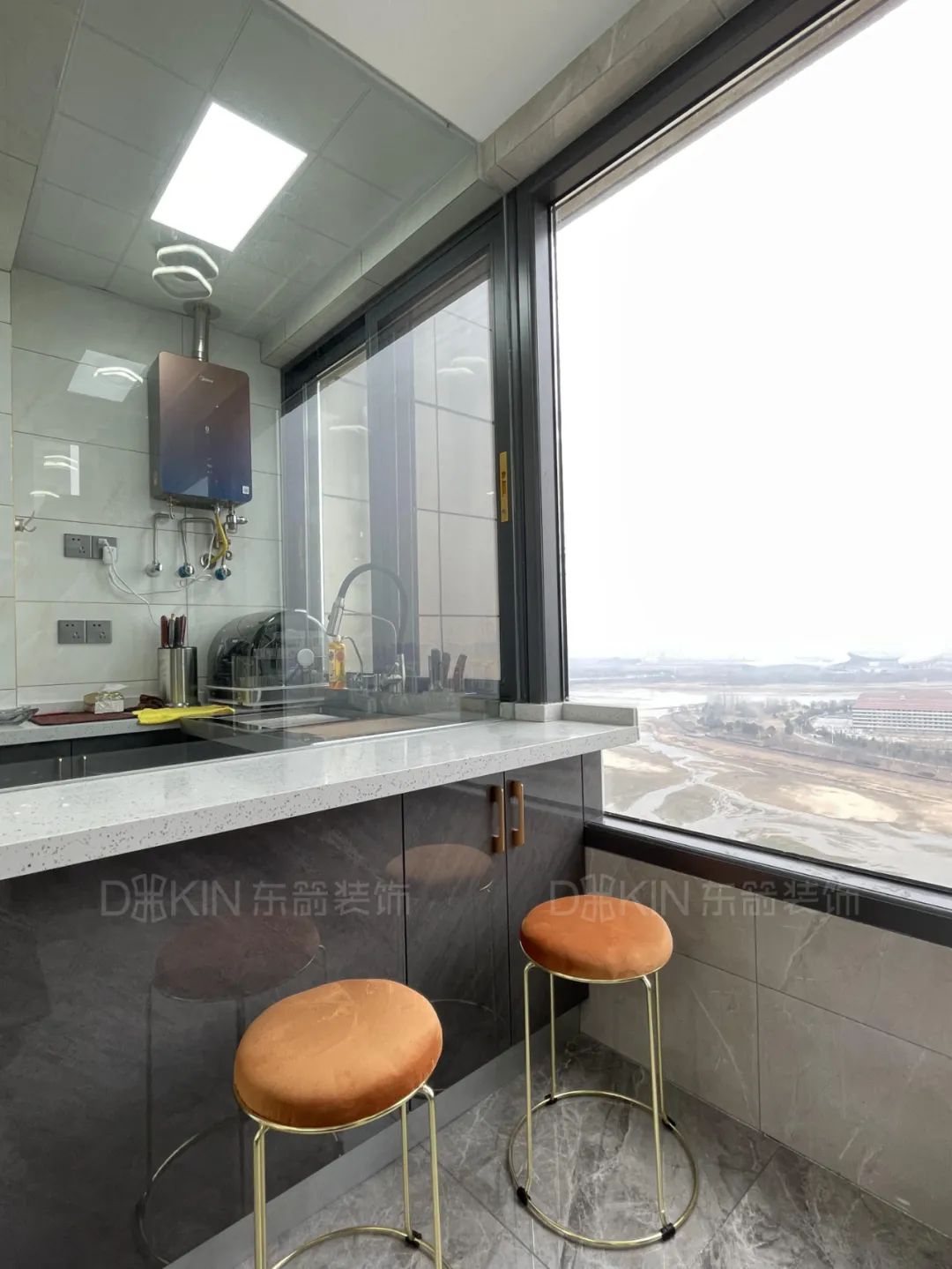 1.廚房為L(zhǎng)型設(shè)計(jì),墻面鏤空做了玻璃和西廚臺(tái)面更顯檔次。