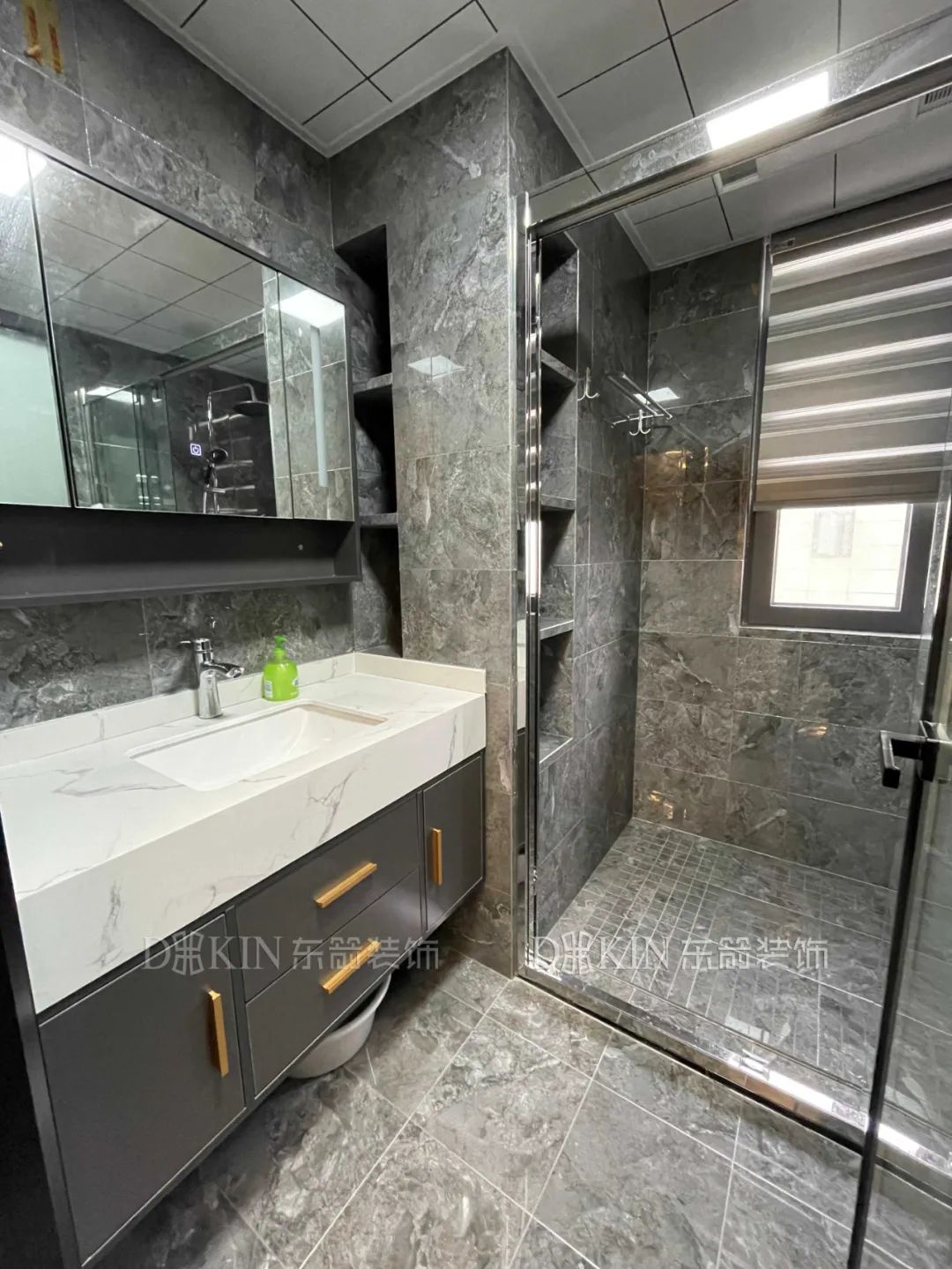 浴室用玻璃隔斷做了干濕分離,透明玻璃讓空間更通透,浴室柜碰撞出有格調(diào)的質(zhì)感。