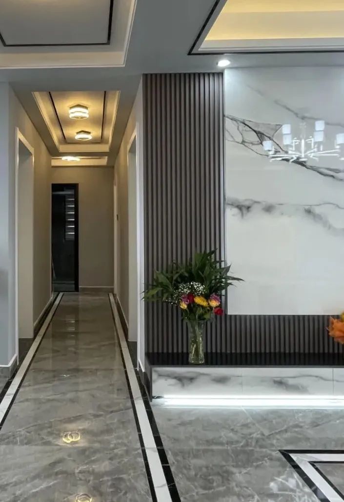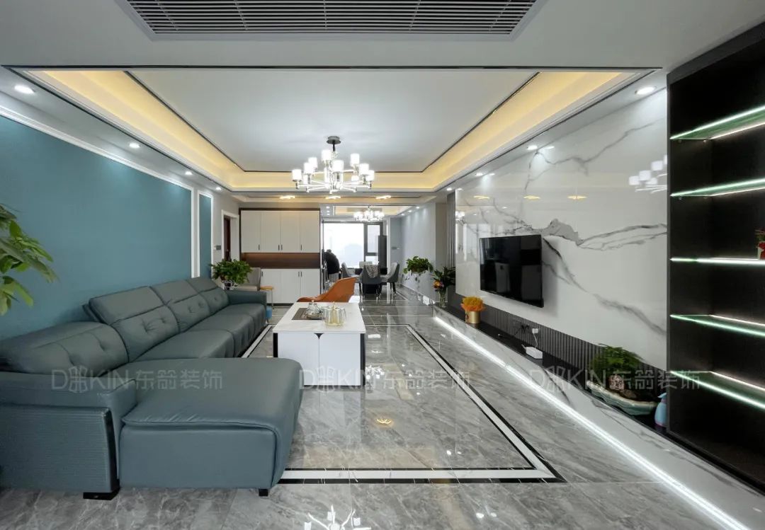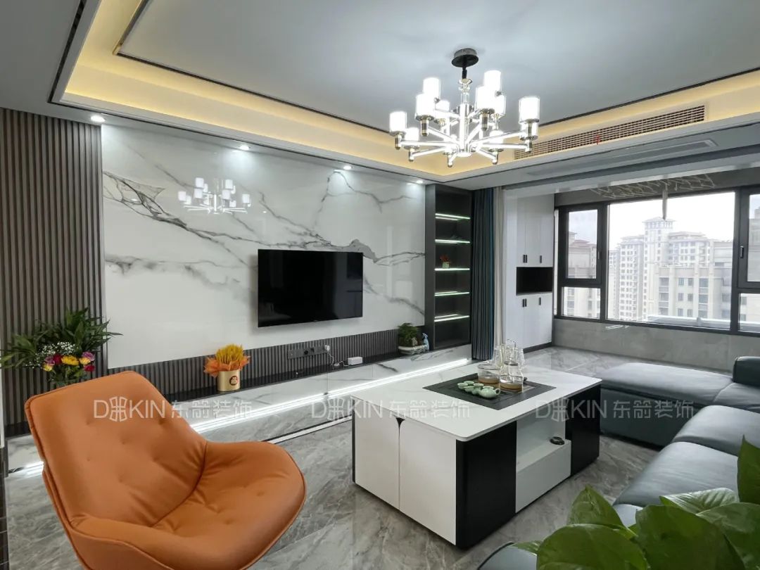 4.電視背景墻采用的是巖板、木飾面、壁臺(tái)加組合柜設(shè)計(jì),現(xiàn)代感十足。