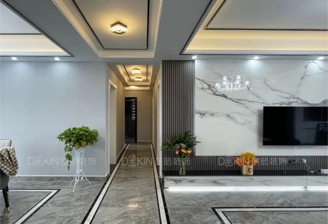 客廳整體南北通透,空間寬敞,巖板和壁臺(tái)的背景墻,以柔和簡(jiǎn)單的低飽和度黑白灰搭配裝飾,自然舒適。