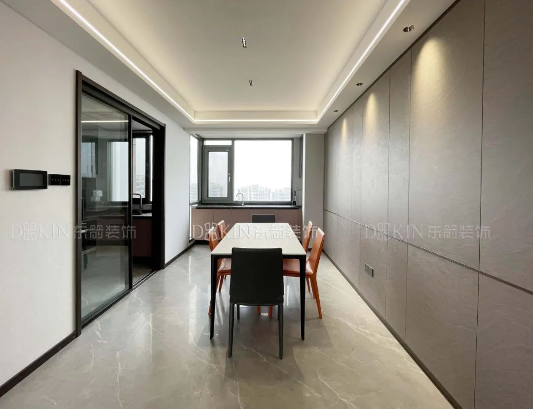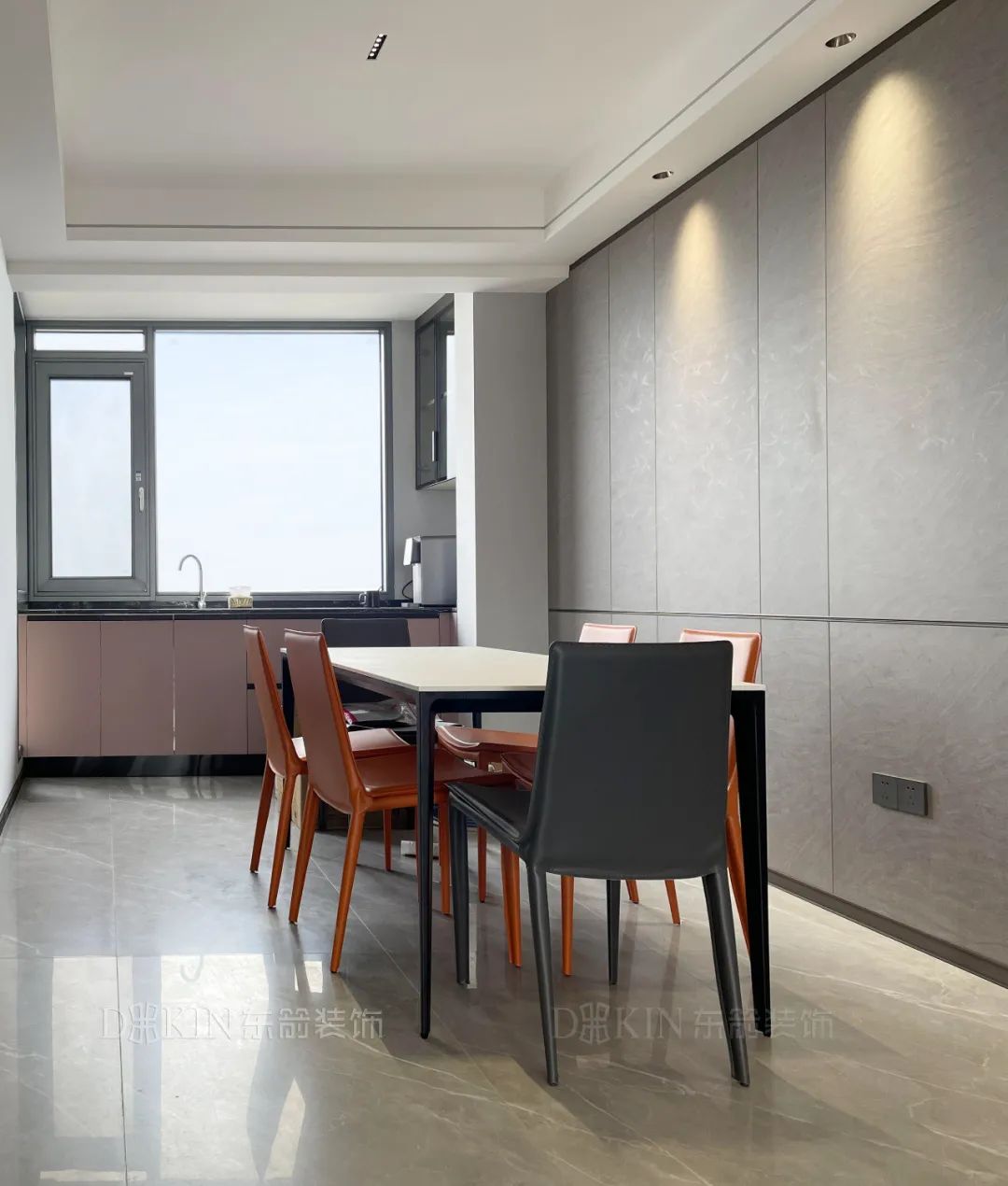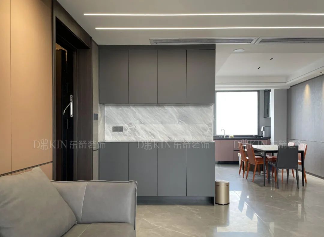 餐廳空間保持自然質(zhì)感采用了黑白灰風(fēng)格,水吧臺增添實(shí)用性和休閑設(shè)計(jì)感,讓家里變得溫馨起來。
