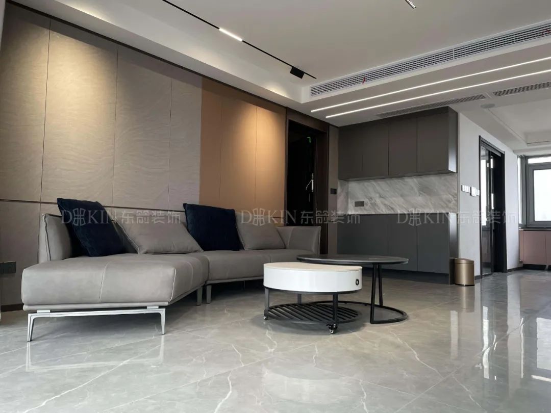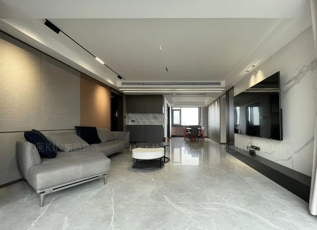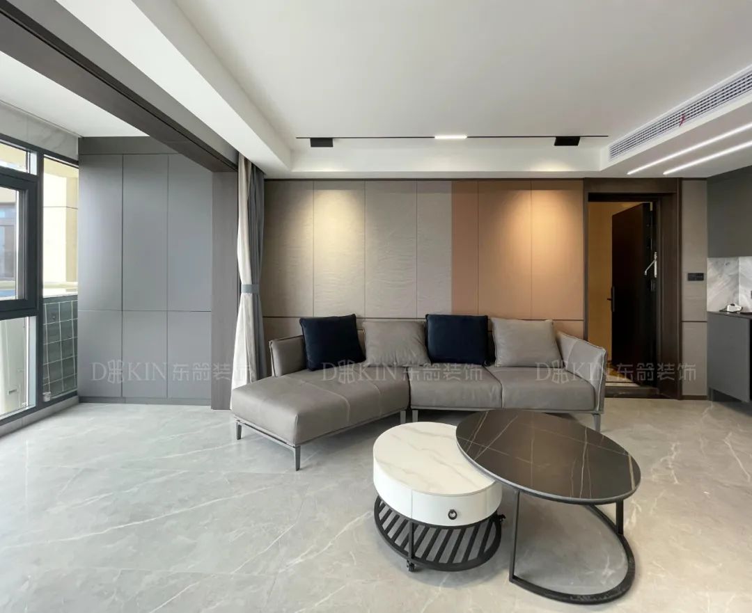 客廳整體南北通透,空間寬闊,巖板和壁臺的背景墻,以柔和簡單的低飽和度淺灰搭配裝飾,自然舒適。