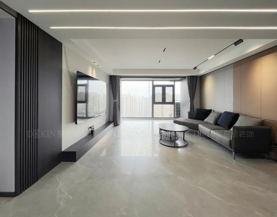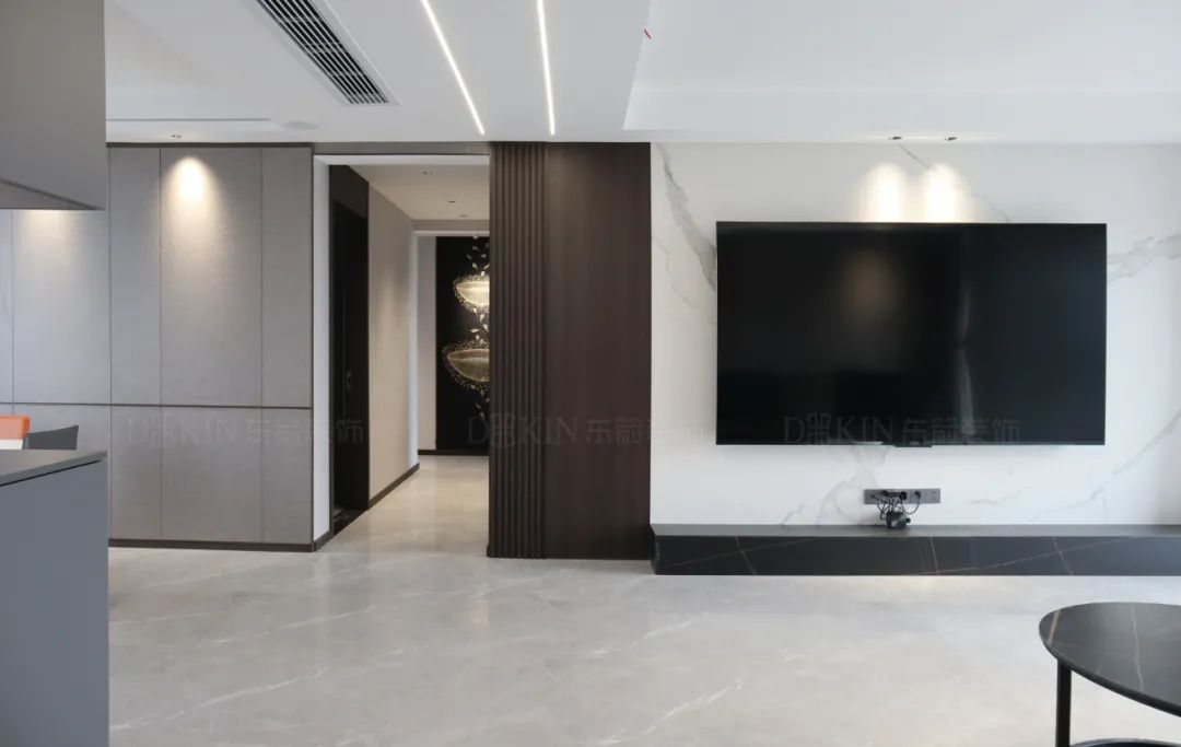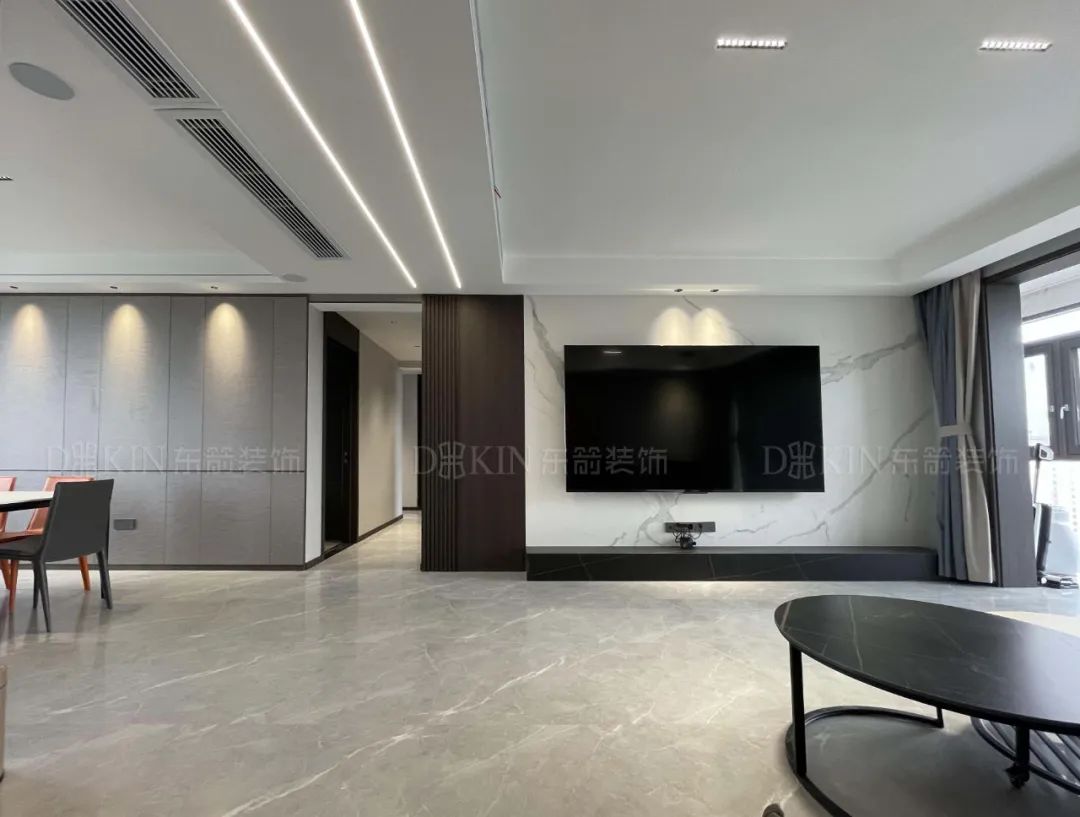 4.客廳采用的是巖板、木飾面、壁臺設(shè)計(jì),無主燈搭配線條燈帶。