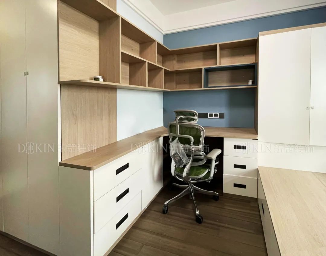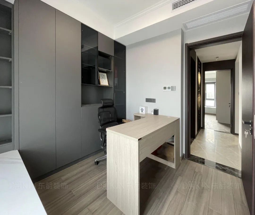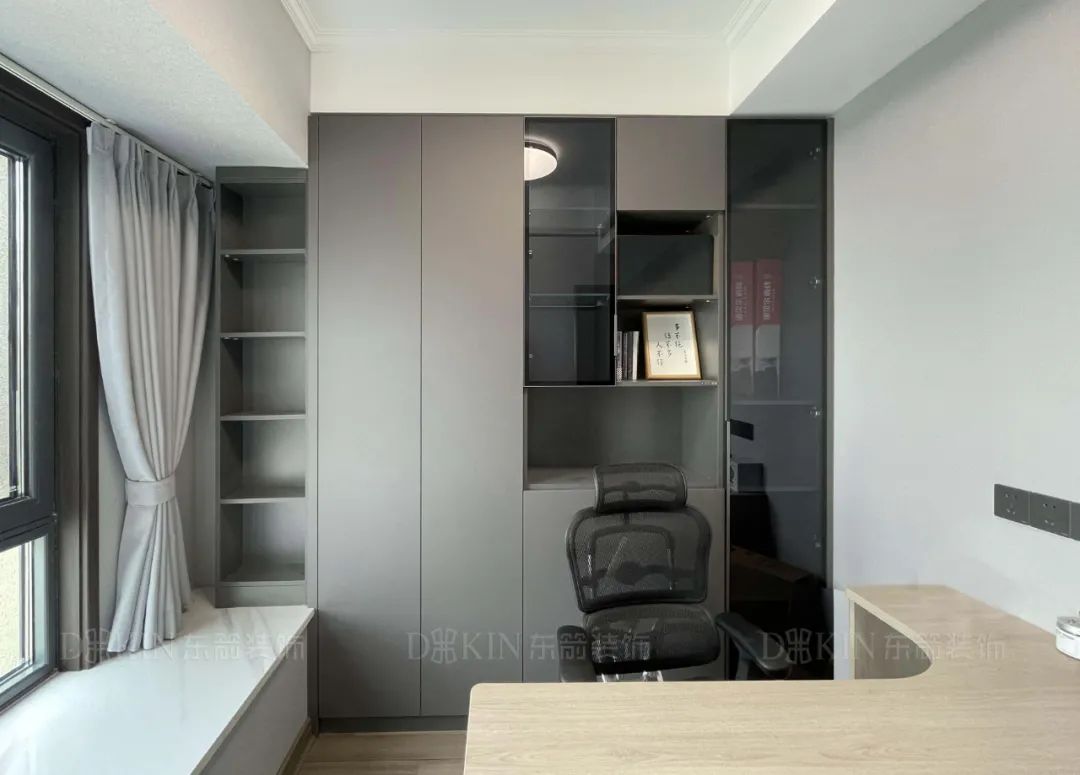 定制書桌和書柜滿足辦公和閱讀需求,灰色搭配也增加了空間設(shè)計(jì)感和實(shí)用性。